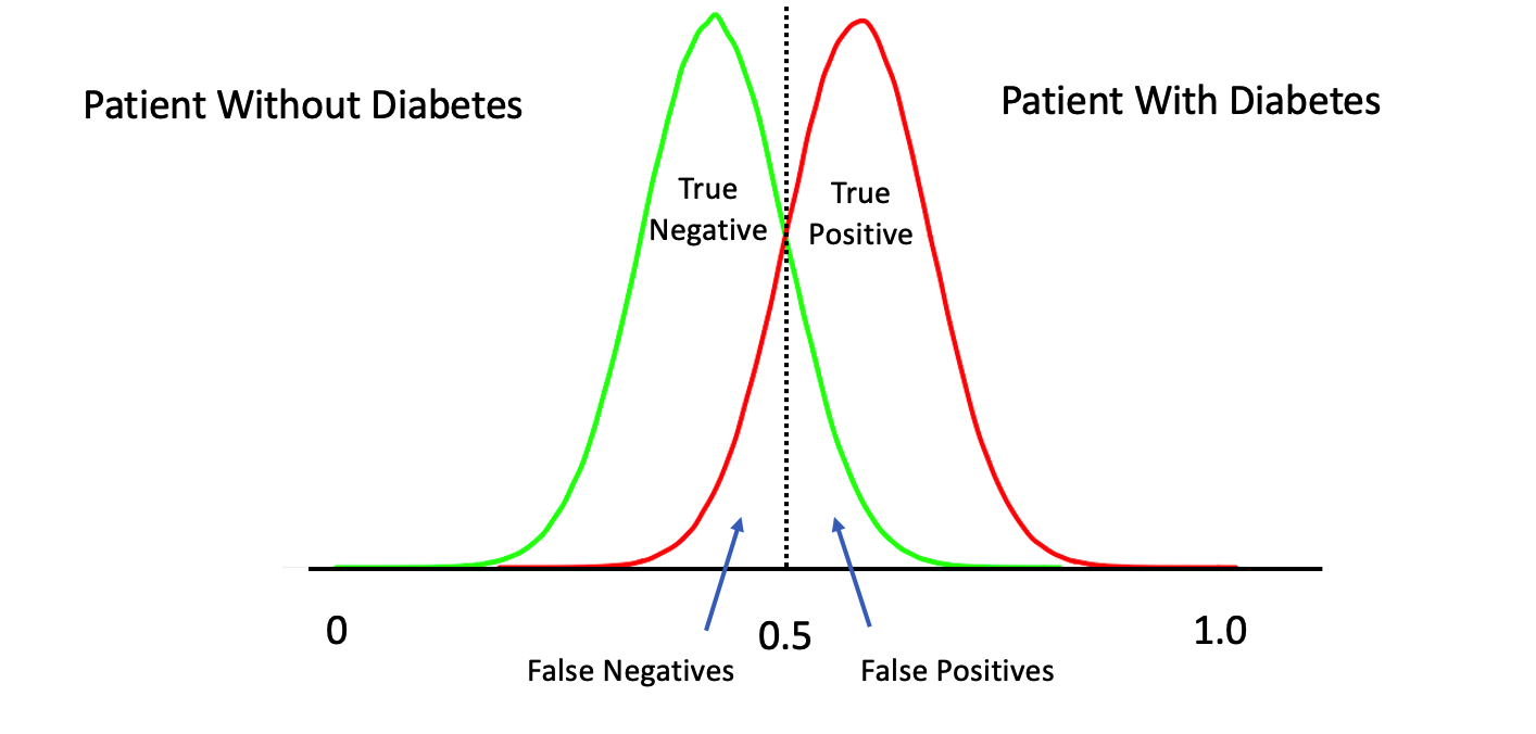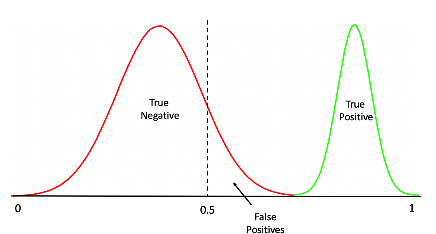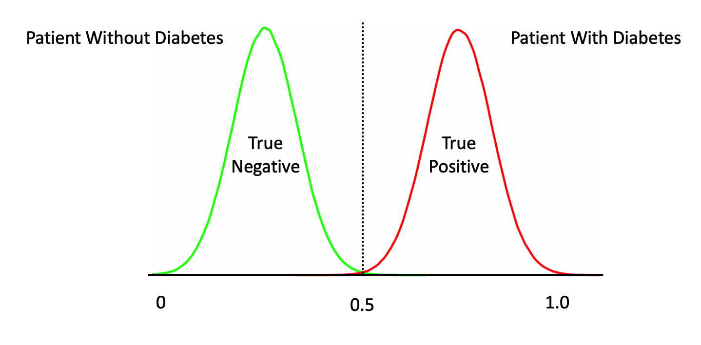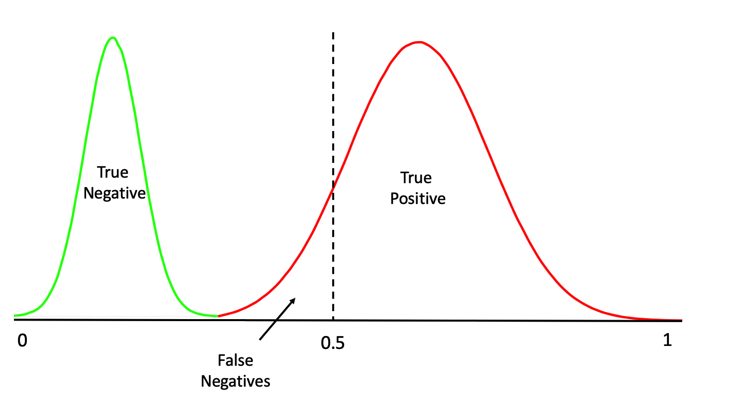 Note that this is a rare situation wherein our model has given us a clean separation between negative and positive cases. We could have something like this: