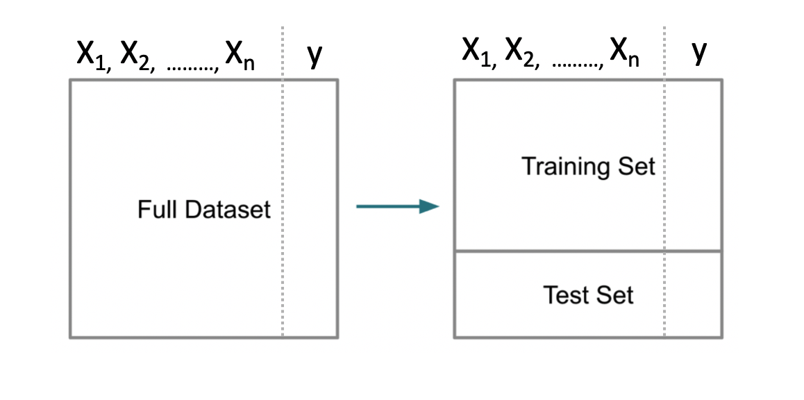 A fundamental approach used in ML is to segment data into a “training” set which is some percentage of the original data - say 80%. The remaining 20% would be assigned to a “test” data set. Then we build a model on our training data set after which we use that model to predict outcomes for the test data set. This looks like the following.