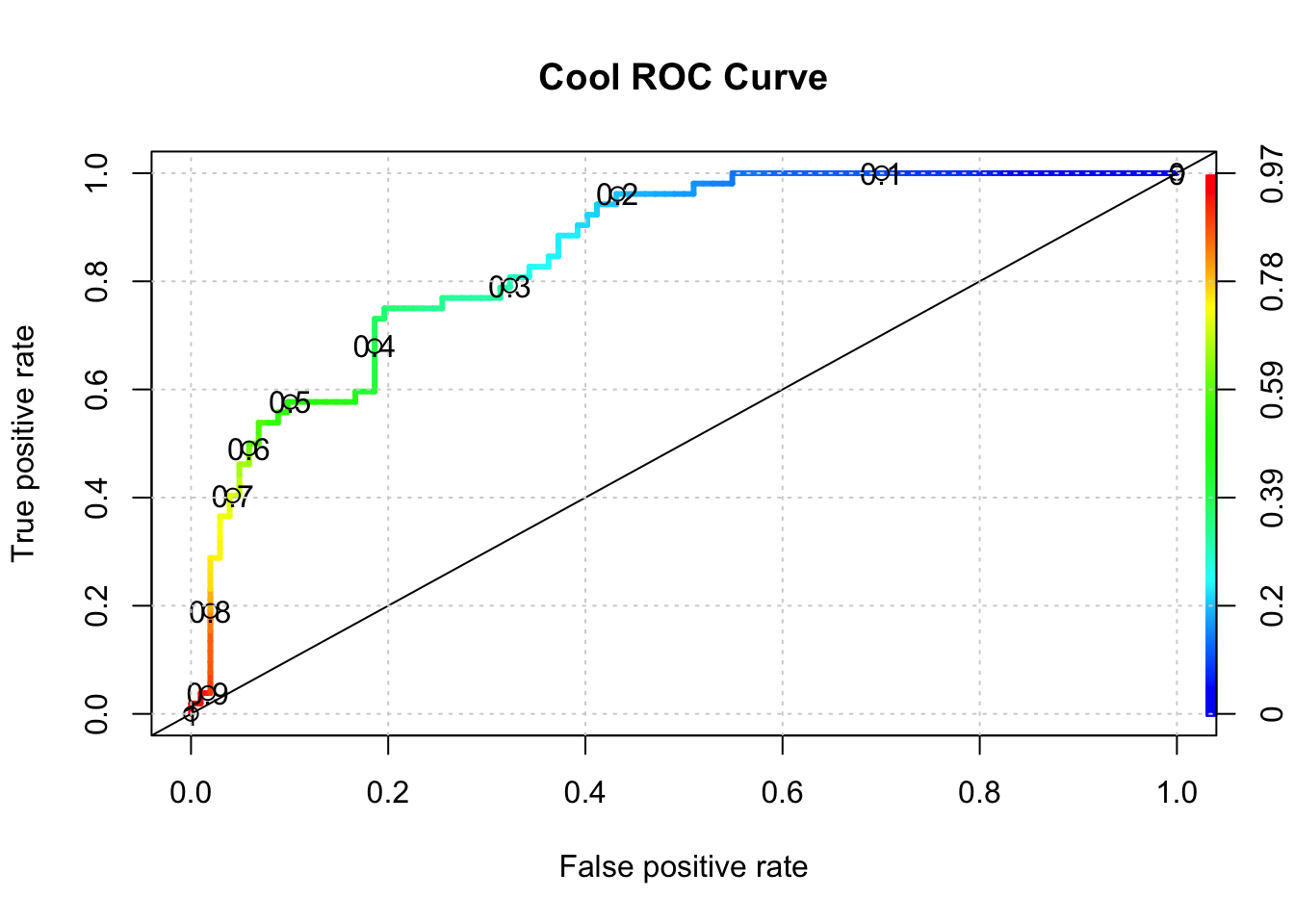 One way to do this is to use something known as the ROC curve. Luckily, R has functions to do this. This isn’t surprising as it is a standard tool that has been in use for decades long before the hype of AI and ML was around. The ROC curve gives us a “one stop shop” for estimating a value of alpha that results in maximal area under a curve.
