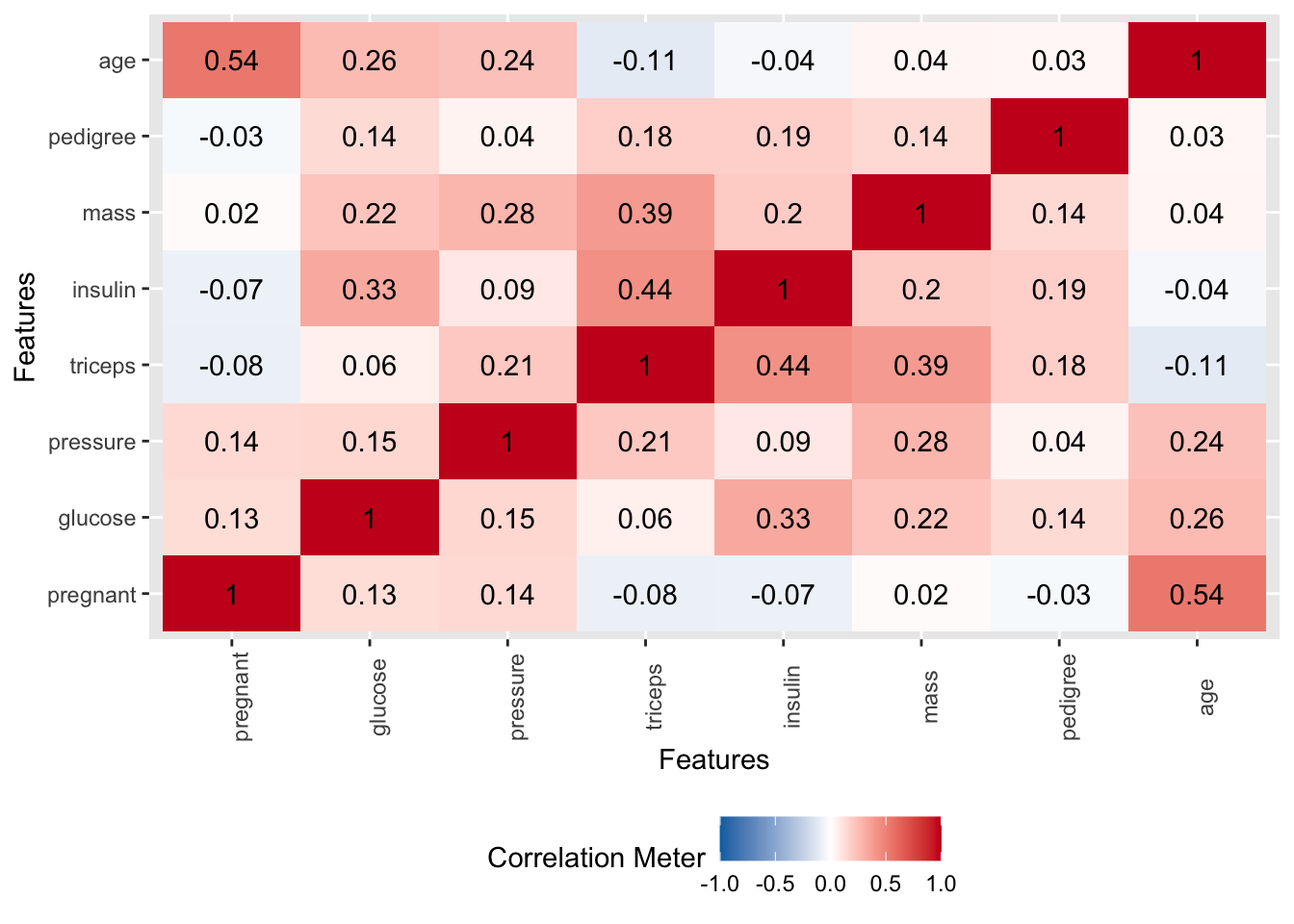 Let’s work though an example of this using caret functions. First, we’ll remove highly correlated predictor variables from consideration. We don’t really have a lot of highly correlated variables. It turns out that “age” is correlated with “pregnant” at a level of 0.54.