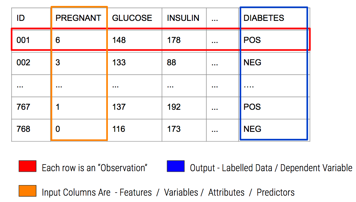 In lookin at the data, there is a variable in the data called “diabetes” which indicates the disease / diabetes status (“pos” or “neg”) of the person. It would be good to come up with a model that we could use with incoming data to determine if someone has diabetes.