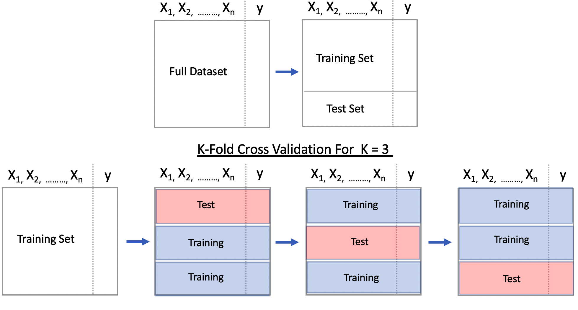 This is a method that gives us multiple estimates of out-of-sample error, rather than a single estimate. In particular, we’ll use an approach called “K-Fold Cross Validation” where we will partition our data into 3 individual “folds”" which are basically equal in size. Then we’ll create a loop that does the following: